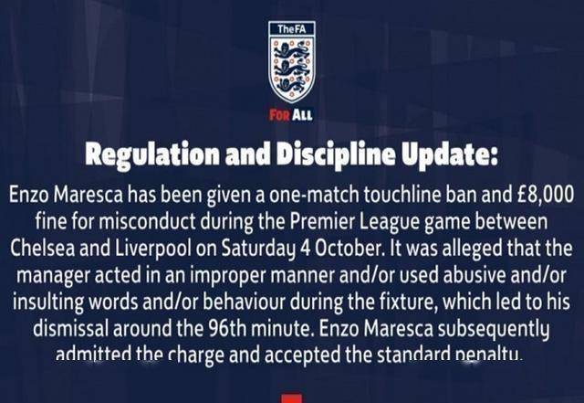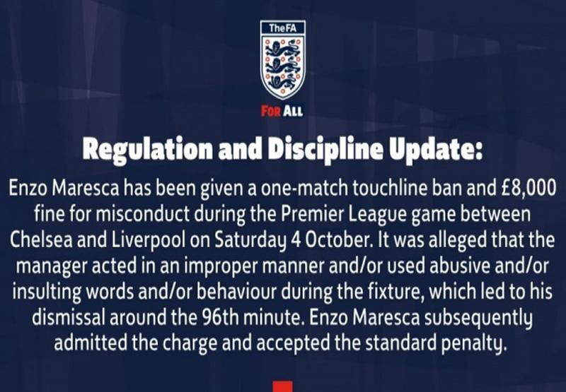 切尔西遭禁赛罚款 无主帅备战下一场比赛 马雷斯卡承认错误